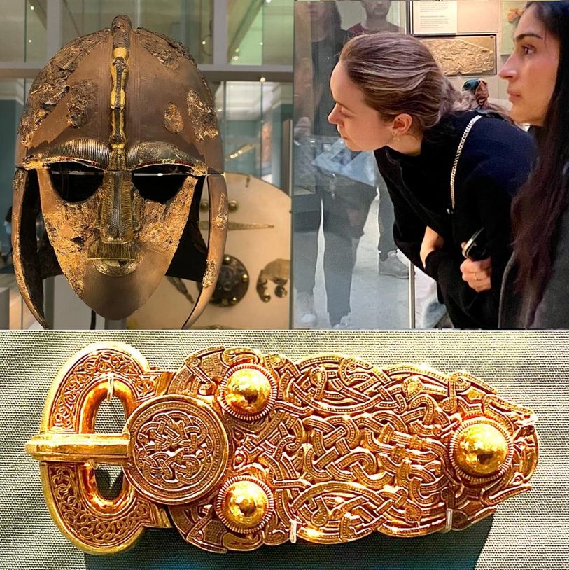Moving onto the Anglo-Saxon period, we found out that a woman, Edith Pretty, who was the owner of the Sutton Hoo estate in Suffolk, initiated an archaeological excavation on her property, which led to the discovery in 1939 of a ship burial, and among the remarkable artefacts found was the Sutton Hoo Helmet, an iconic piece of early 7 th century Anglo-Saxon art and craftsmanship.
